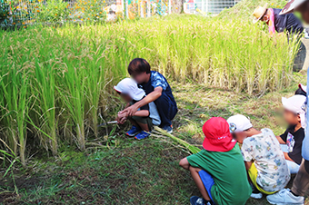 苗の成長を園庭から観察していた子ども達。そんな大きく成長した稲の稲刈りにみんな朝からわくわくドキドキでした。