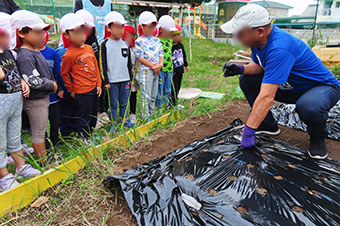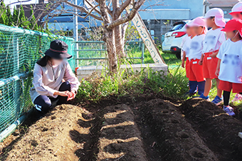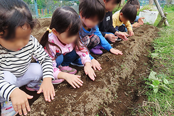 稲刈り後、干された稲は乾燥して、黄色くなりその稲を昔ながらの足踏み式脱穀機で脱穀していきました。 円柱を横にしたような足踏み式脱穀機はペダルを足で踏みながら回して動かします。 高速回転する脱穀機に稲を近づけると「ぱぁ〜!!」と音を立てて稲の先端のもみがとれる仕組みになっています。 干した稲を持ち、実際にやってみた脱穀作業。 脱穀機の中できれいに稲ともみが分かれる瞬間の衝撃に、みんな感動していました。 「楽しい」「もう1回やりたい」という声も沢山あり稲刈り同様、何度も繰り返し体験することができました。 そのあと、脱穀機で取りきれなかったもみを一粒一粒とっていく作業も経験し、お米作りの大変さを身を持って体験したゆりぐみさんの子ども達でした。 ■令和7年10月24日 さつまいもの収穫(ゆり)