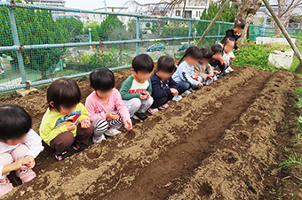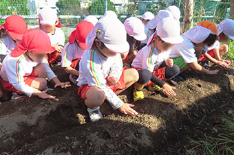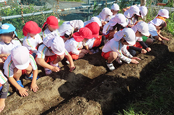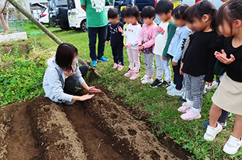 5月に植えたさつまいもの苗は、たくさんのつるとはっぱをつけ、いよいよ収穫の日を迎えました。 ゆりぐみのみんなで畑に入り、一斉に芋ほり開始〜!! 勢いよく掘り始めるお友達や、恐る恐る土をはらっていくお友達…と様々(笑) それでも最後には、みんなで奥深くに入っているなかなか採れないお芋を、手を真っ黒にしながら夢中になって掘っていました。 土の中から出てきたお芋はとってもきれいで、形も様々。 大小たくさんのお芋がでてきてみんなで大喜びでした。 ■令和7年10月29日 10月お誕生会