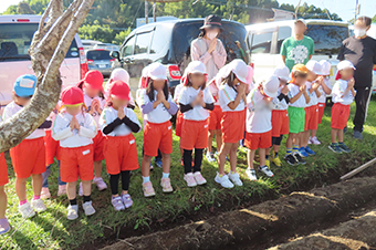 前日の雨でのグラウンドコンディションと気温30度を超す予報のため、体育館での運動会となりました。 家族の方々の温かい応援の中、かっこいい所を見せようと一生懸命頑張る姿にたくさんの感動と元気をもらいました。 子ども達一人ひとりが自分の持っている力を存分に発揮し躍動した運動会。 それぞれに大きな自信になったことでしょう。 子ども達みんなに拍手とありがとうを贈ります。 未満児クラスの親子団技や以上児クラスの親子ダンス、ゆりぐみ親子リレー等、子ども達も保護者の方々も楽しそうに参加する姿に私達も幸せな気持ちになりました。 ■令和7年10月15日 秋の遠足
