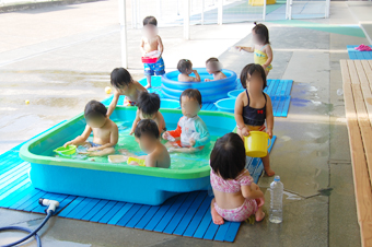 1Fの未満児用プールでは、「プールからあがるよ〜」と声をかけても、「あがりたくな〜い」と言わんばかりにいつまでも遊び続ける子ども達…。みんなをプールから上げるのに一苦労でした。(笑)