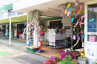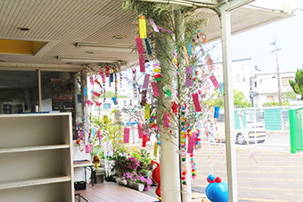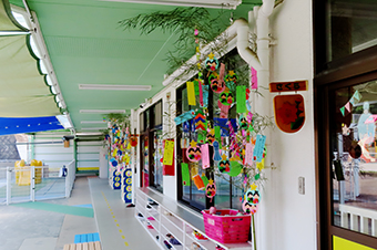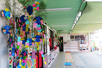 今年も保育園の玄関口に華やかな七夕飾りが飾られました。