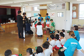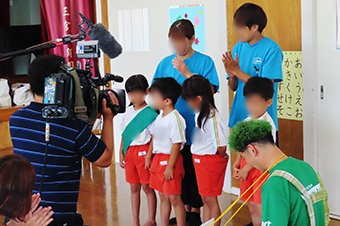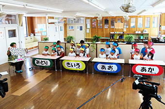 カメラやマイクといった機材に囲まれ、少し緊張気味の子ども達でしたが、子ども達ならではの面白い回答やとなみ〜の楽しいヒントに、終始和やかな雰囲気の中での撮影となりました。