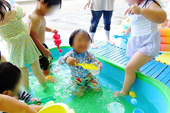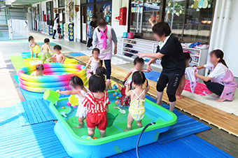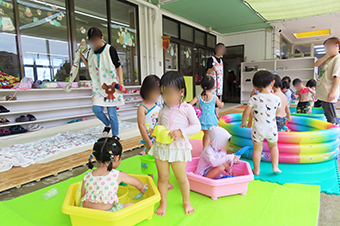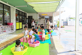 写真は1Fのテラスの水遊びの様子と保育園屋上にあるプール遊びの様子です。
