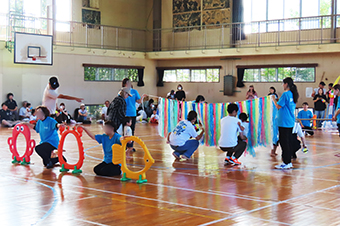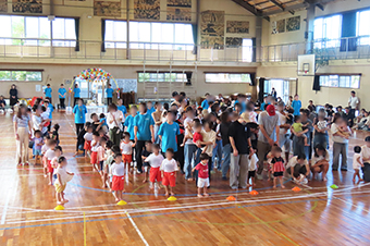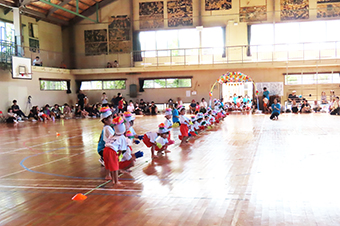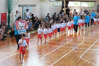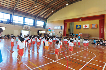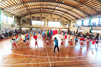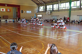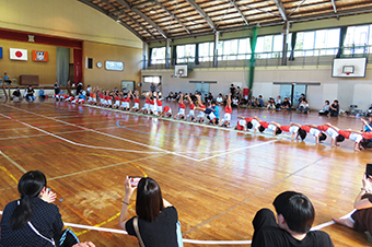 前日の雨でのグラウンドコンディションと気温30度を超す予報のため、体育館での運動会となりました。