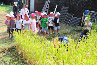 最初に保育士が稲の刈り方をやってみせると「オオォ〜!!」と歓声があがりました。