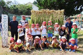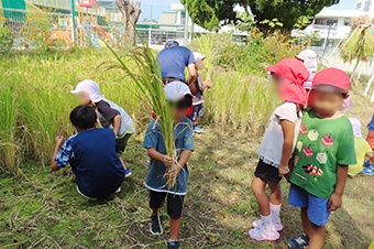 苗の成長を園庭から観察していた子ども達。そんな大きく成長した稲の稲刈りにみんな朝からわくわくドキドキでした。